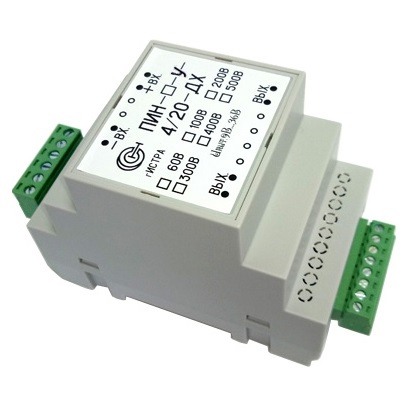 Преобразователи измерительные серии ПИН-_-У-4/20-ДХ созданы для преобразования напряжения постоянного, переменного и импульсных токов в стандартный токовый сигнал 4/20 мА с гальванической развязкой входной цепи и цепей контроля.